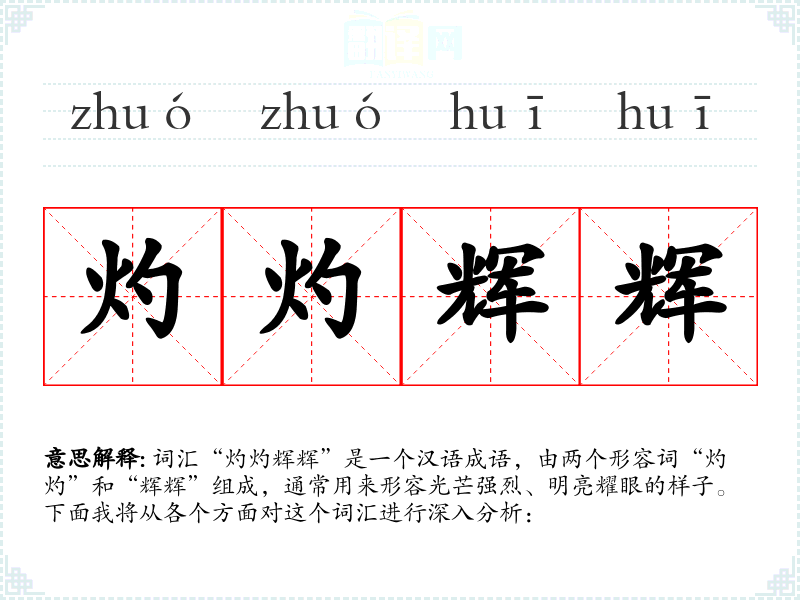 词汇“灼灼辉辉”是一个汉语成语,由两个形容词“灼灼”和“辉辉”组成,通常用来形容光芒强烈、明亮耀眼的样子。下面我将从各个方面对这个词汇进行深入分析: