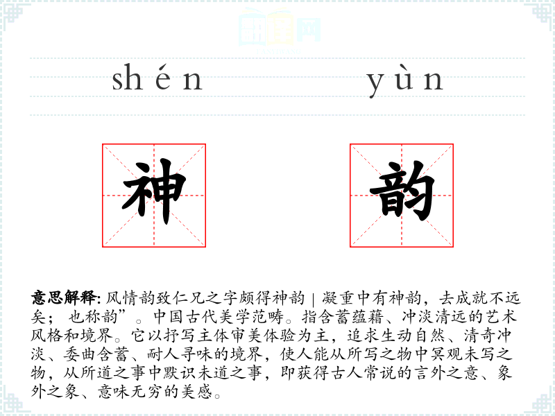 1.风情韵致仁兄之字颇得神韵|凝重中有神韵,去成就不远矣; 也称韵”。中国古代美学范畴。指含蓄蕴藉、冲淡清远的艺术风格和境界。它以抒写主体审美体验为主,追求生动自然、清奇冲淡、委曲含蓄、耐人寻味的境界,使人能从所写之物中冥观未写之物,从所道之事中默识未道之事,即获得古人常说的言外之意、象外之象、意味无穷的美感。