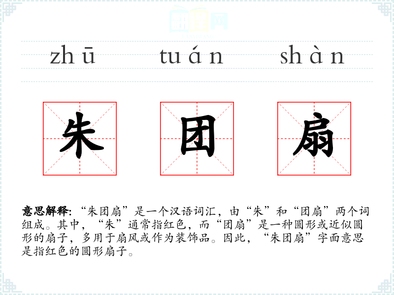 “朱团扇”是一个汉语词汇,由“朱”和“团扇”两个词组成。其中,“朱”通常指红色,而“团扇”是一种圆形或近似圆形的扇子,多用于扇风或作为装饰品。因此,“朱团扇”字面意思是指红色的圆形扇子。