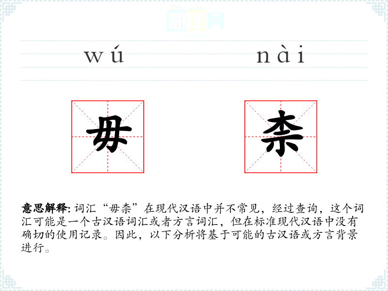 词汇“毋柰”在现代汉语中并不常见,经过查询,这个词汇可能是一个古汉语词汇或者方言词汇,但在标准现代汉语中没有确切的使用记录。因此,以下分析将基于可能的古汉语或方言背景进行。