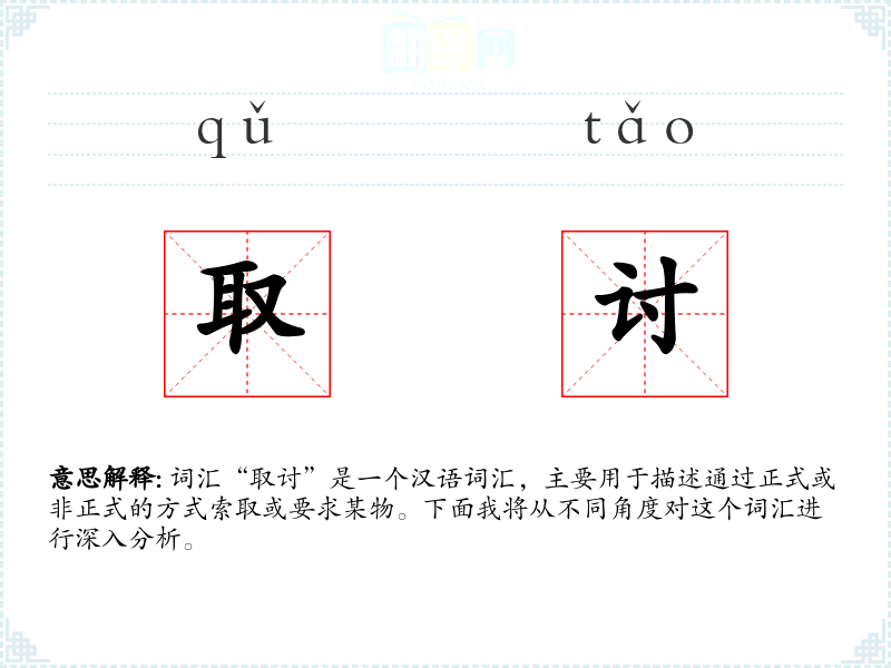 词汇“取讨”是一个汉语词汇,主要用于描述通过正式或非正式的方式索取或要求某物。下面我将从不同角度对这个词汇进行深入分析。