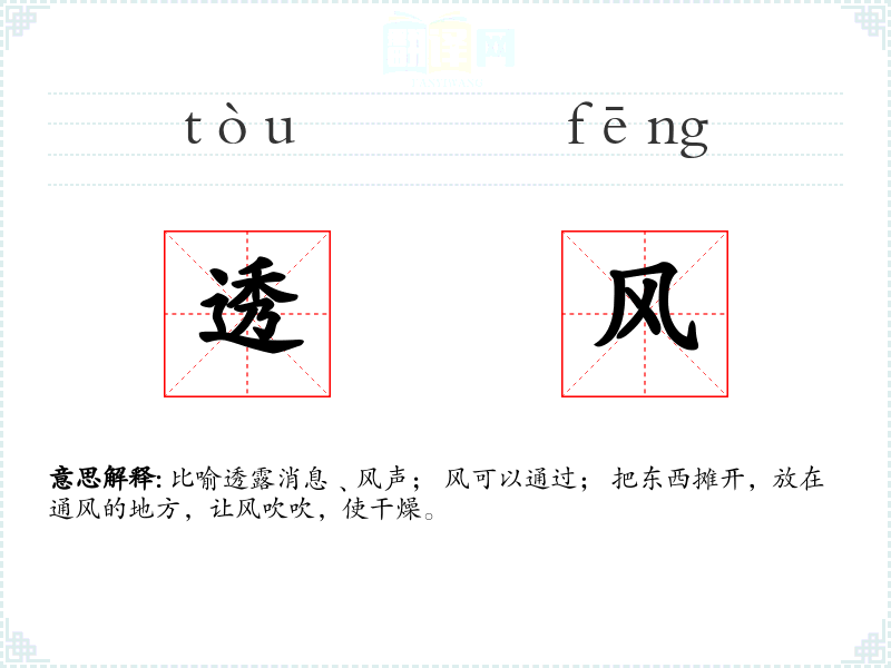 比喻透露消息﹑风声; 风可以通过; 把东西摊开,放在通风的地方,让风吹吹,使干燥。