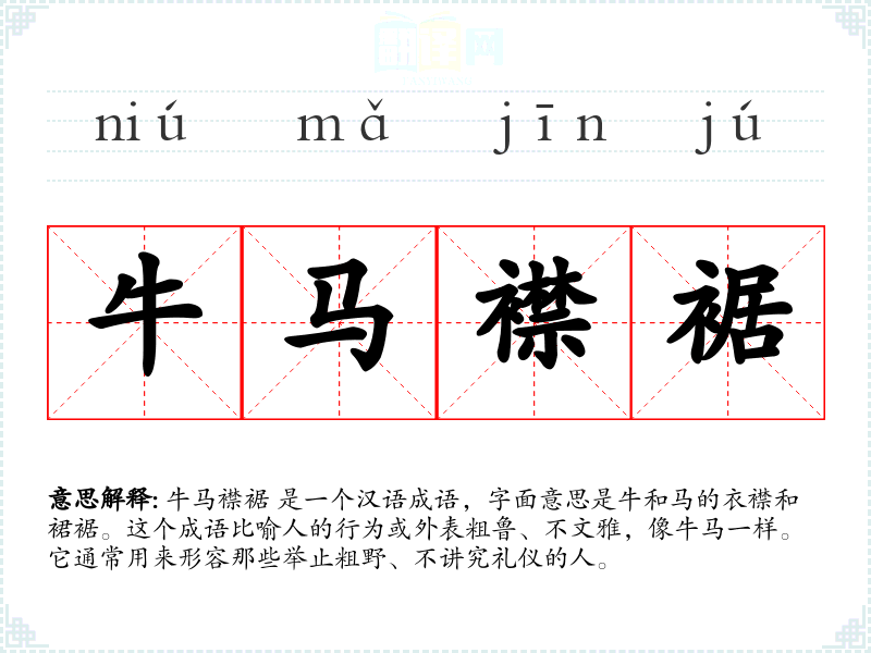 牛马襟裾 是一个汉语成语,字面意思是牛和马的衣襟和裙裾。这个成语比喻人的行为或外表粗鲁、不文雅,像牛马一样。它通常用来形容那些举止粗野、不讲究礼仪的人。