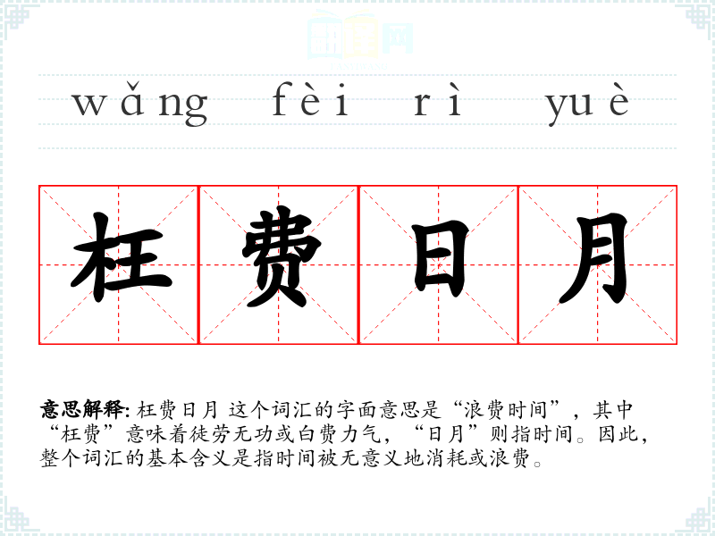 枉费日月 这个词汇的字面意思是“浪费时间”,其中“枉费”意味着徒劳无功或白费力气,“日月”则指时间。因此,整个词汇的基本含义是指时间被无意义地消耗或浪费。