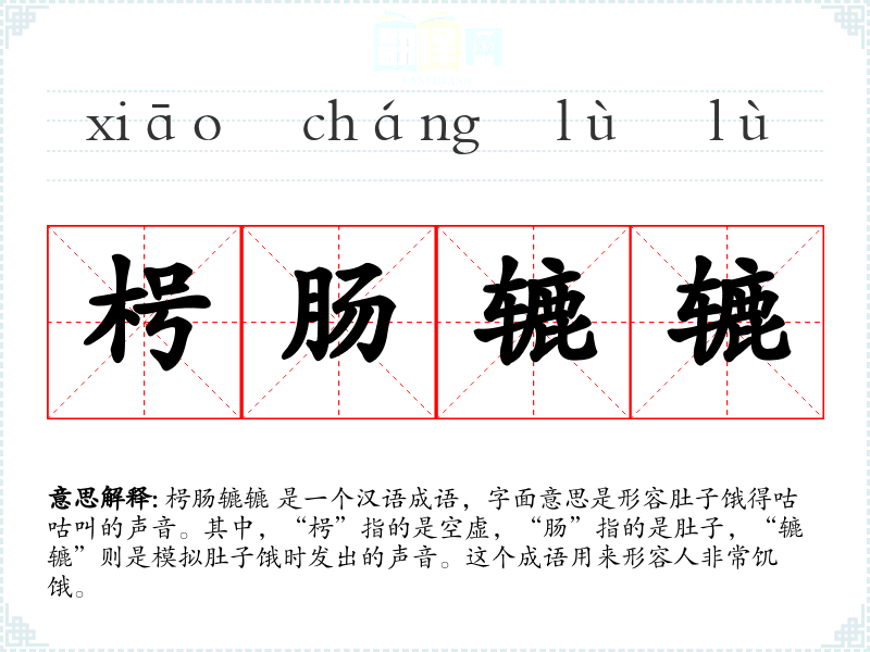 枵肠辘辘 是一个汉语成语,字面意思是形容肚子饿得咕咕叫的声音。其中,“枵”指的是空虚,“肠”指的是肚子,“辘辘”则是模拟肚子饿时发出的声音。这个成语用来形容人非常饥饿。