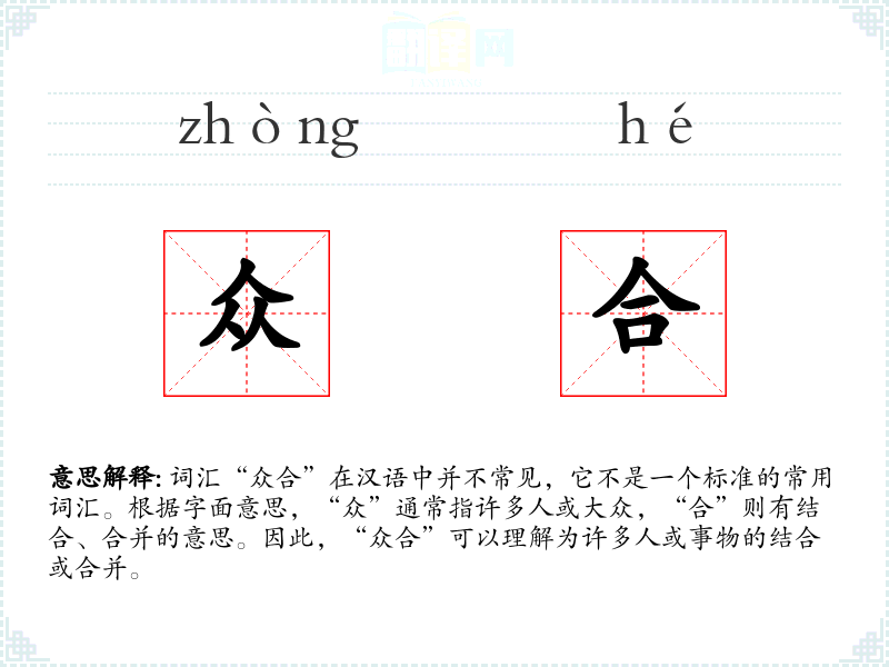 词汇“众合”在汉语中并不常见,它不是一个标准的常用词汇。根据字面意思,“众”通常指许多人或大众,“合”则有结合、合并的意思。因此,“众合”可以理解为许多人或事物的结合或合并。