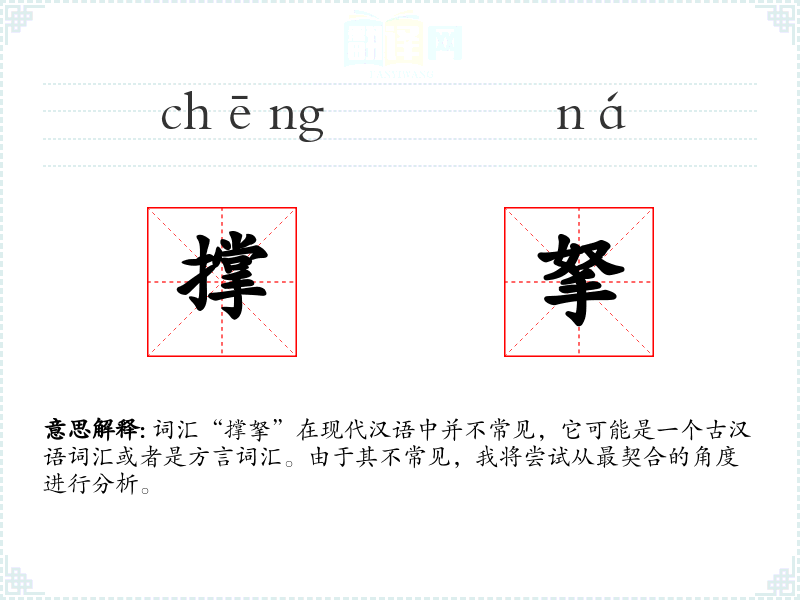 词汇“撑拏”在现代汉语中并不常见,它可能是一个古汉语词汇或者是方言词汇。由于其不常见,我将尝试从最契合的角度进行分析。