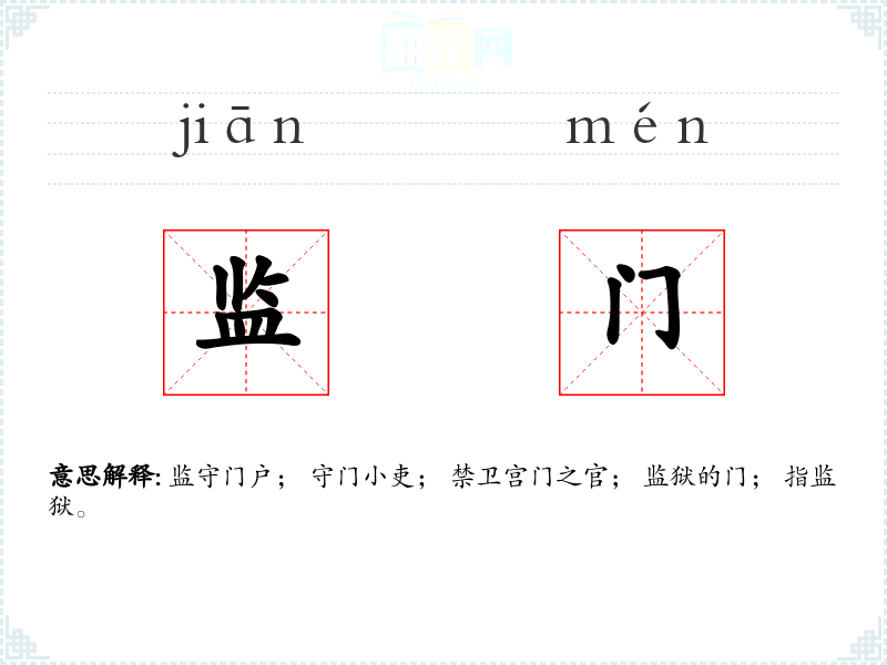 监守门户; 守门小吏; 禁卫宫门之官; 监狱的门; 指监狱。