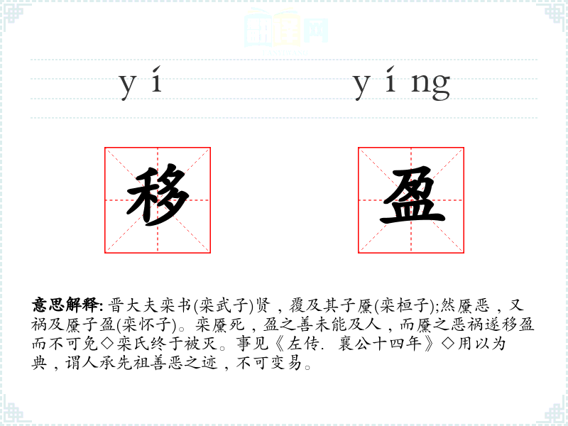 1.晋大夫栾书(栾武子)贤﹐覆及其子黡(栾桓子);然黡恶﹐又祸及黡子盈(栾怀子)。栾黡死﹐盈之善未能及人﹐而黡之恶祸遂移盈而不可免◇栾氏终于被灭。事见《左传.襄公十四年》◇用以为典﹐谓人承先祖善恶之迹﹐不可变易。