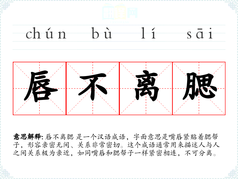唇不离腮 这个成语的词源较为模糊,但可以推测它来源于人们对亲密关系的直观感受。随着时间的推移,这个成语在汉语中被广泛使用,成为描述亲密关系的常用表达。