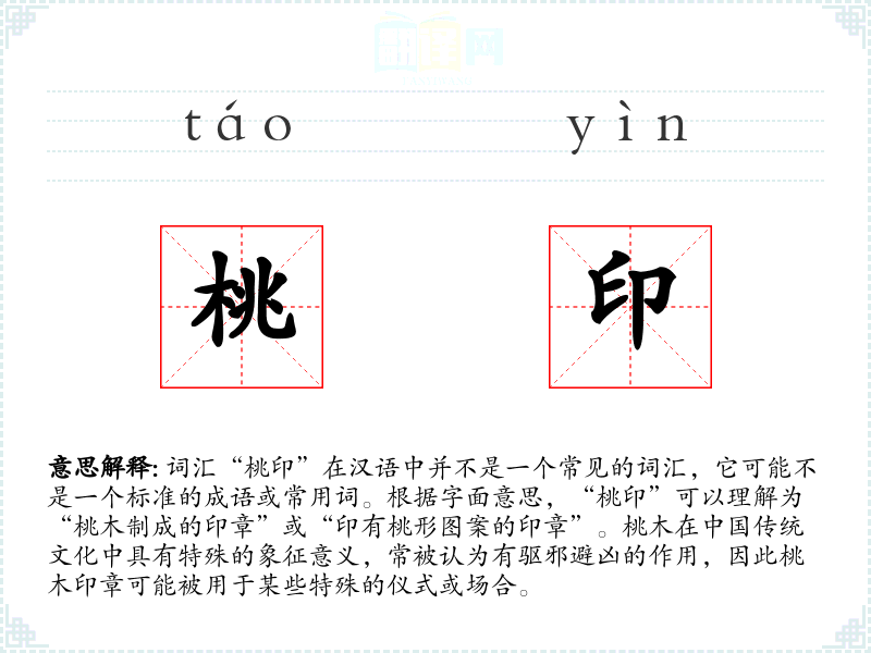 - 字面意思:桃木制成的印章或印有桃形图案的印章。