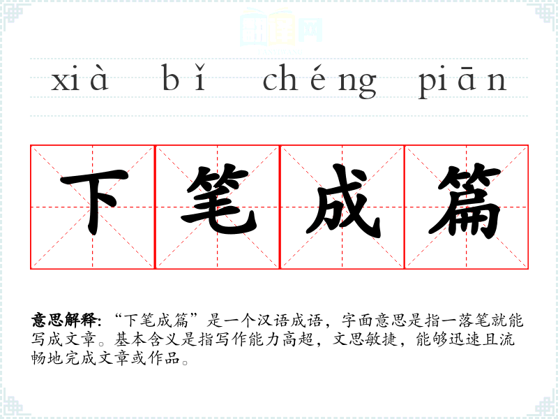 在英语中,类似的表达可能是“write fluently”或“compose with ease”,但这些表达没有“下笔成篇”这个成语所蕴含的深厚文化底蕴和诗意。