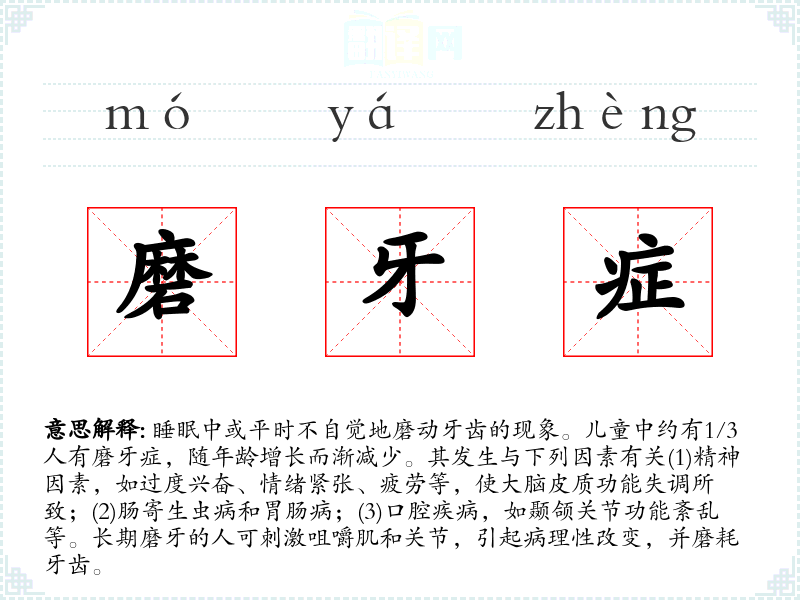 1.睡眠中或平时不自觉地磨动牙齿的现象。儿童中约有1/3人有磨牙症,随年龄增长而渐减少。其发生与下列因素有关(1)精神因素,如过度兴奋、情绪紧张、疲劳等,使大脑皮质功能失调所致;(2)肠寄生虫病和胃肠病;(3)口腔疾病,如颞颌关节功能紊乱等。长期磨牙的人可刺激咀嚼肌和关节,引起病理性改变,并磨耗牙齿。