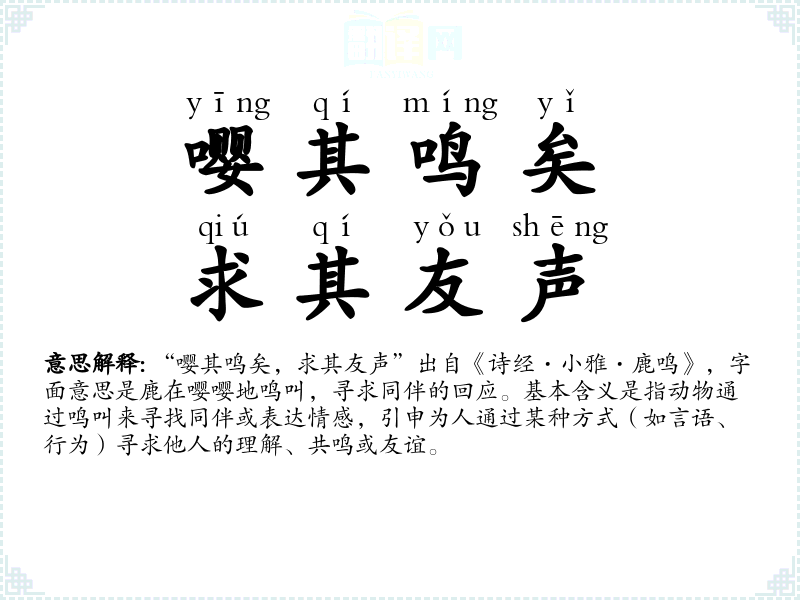 “嘤其鸣矣,求其友声”出自《诗经·小雅·鹿鸣》,字面意思是鹿在嘤嘤地鸣叫,寻求同伴的回应。基本含义是指动物通过鸣叫来寻找同伴或表达情感,引申为人通过某种方式(如言语、行为)寻求他人的理解、共鸣或友谊。