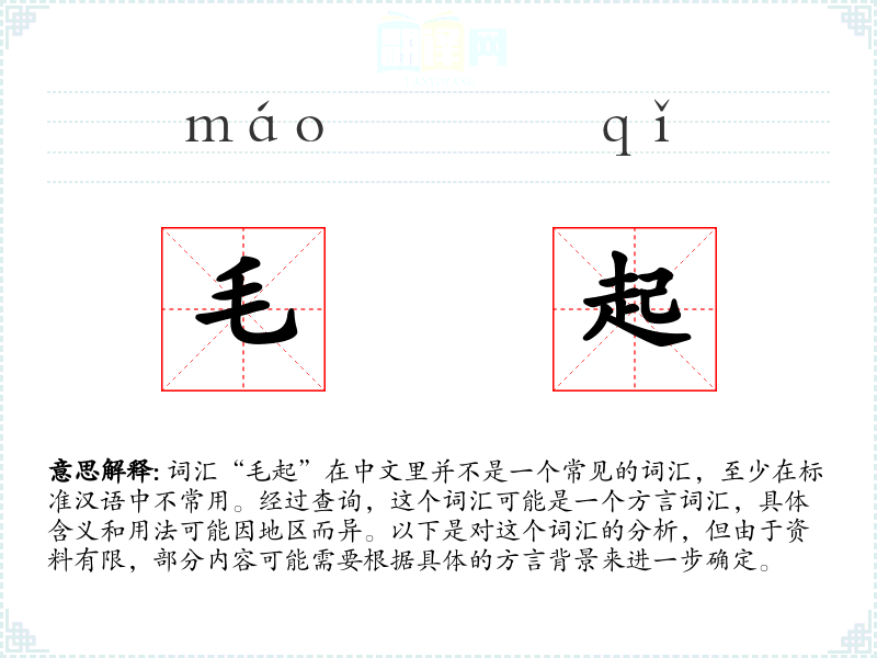 词汇“毛起”在中文里并不是一个常见的词汇,至少在标准汉语中不常用。经过查询,这个词汇可能是一个方言词汇,具体含义和用法可能因地区而异。以下是对这个词汇的分析,但由于资料有限,部分内容可能需要根据具体的方言背景来进一步确定。