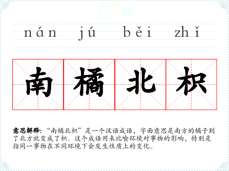 “南橘北枳”是一个汉语成语,字面意思是南方的橘子到了北方就变成了枳。这个成语用来比喻环境对事物的影响,特别是指同一事物在不同环境下会发生性质上的变化。