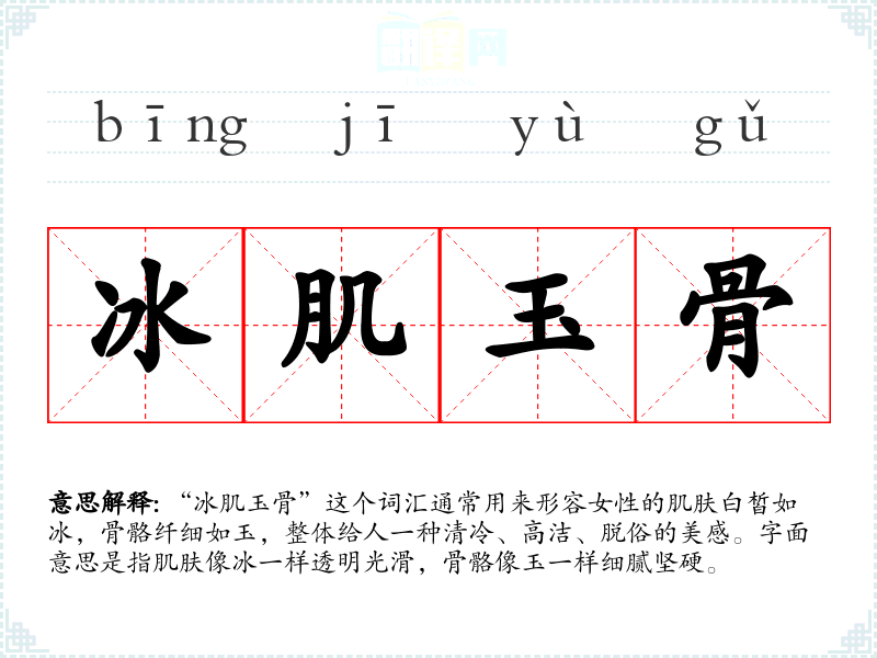 “冰肌玉骨”这个词汇通常用来形容女性的肌肤白皙如冰,骨骼纤细如玉,整体给人一种清冷、高洁、脱俗的美感。字面意思是指肌肤像冰一样透明光滑,骨骼像玉一样细腻坚硬。