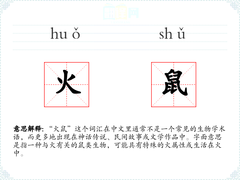 同义词:火灵鼠、火精鼠(这些词汇在神话或幻想文学中可能更为常见) 反义词:冰鼠、水鼠(这些词汇在构建对立或对比的语境中可能出现)