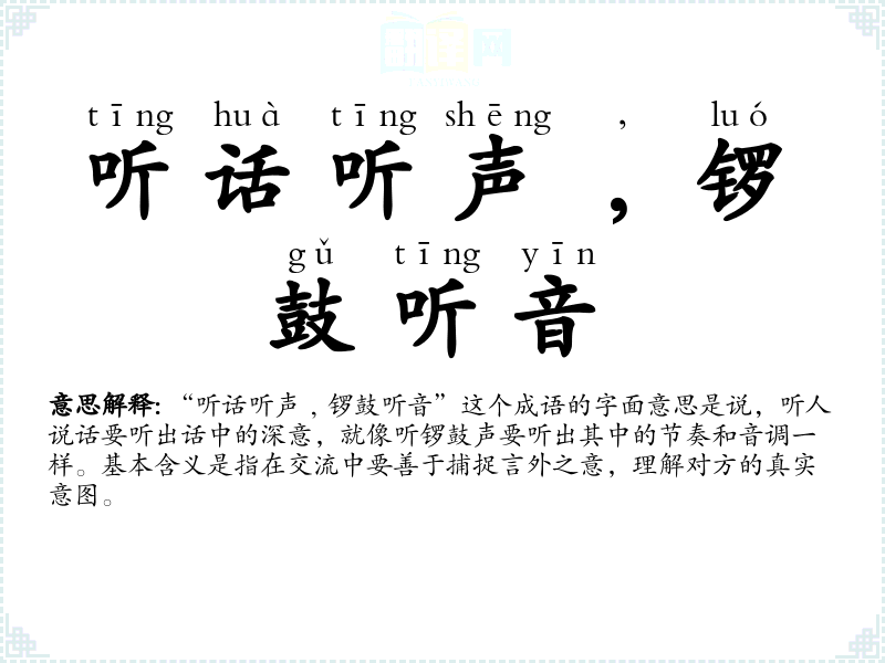 “听话听声﹐锣鼓听音”这个成语的字面意思是说,听人说话要听出话中的深意,就像听锣鼓声要听出其中的节奏和音调一样。基本含义是指在交流中要善于捕捉言外之意,理解对方的真实意图。