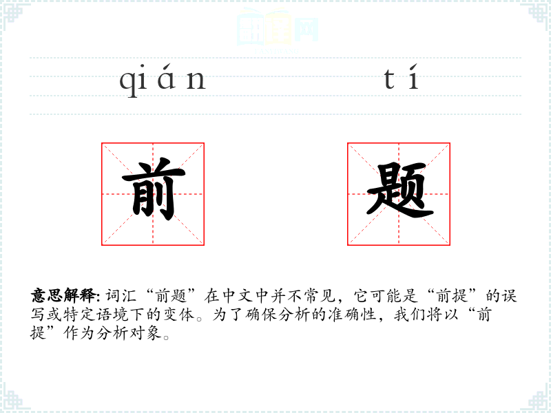 词汇“前题”在中文中并不常见,它可能是“前提”的误写或特定语境下的变体。为了确保分析的准确性,我们将以“前提”作为分析对象。