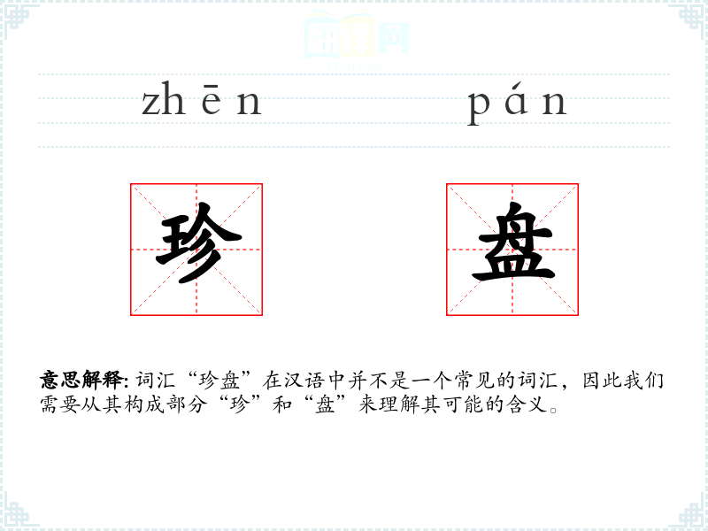 结合这两个字,“珍盘”可能指的是一个盛放珍贵物品的盘子,或者是一个围绕珍贵物品的盘旋动作。