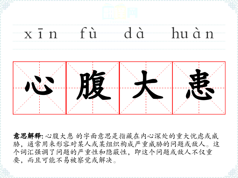 心腹大患 的字面意思是指藏在内心深处的重大忧虑或威胁,通常用来形容对某人或某组织构成严重威胁的问题或敌人。这个词汇强调了问题的严重性和隐蔽性,即这个问题或敌人不仅重要,而且可能不易被察觉或解决。