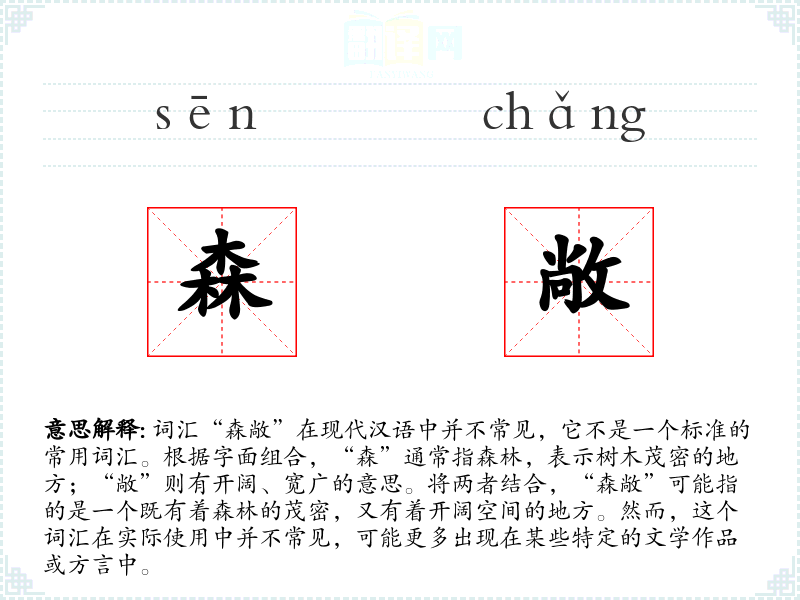 - 由于“森敞”不是一个常用词汇,其词源和演变不太明确,可能源自某些地区的方言或特定文学作品中的创造。