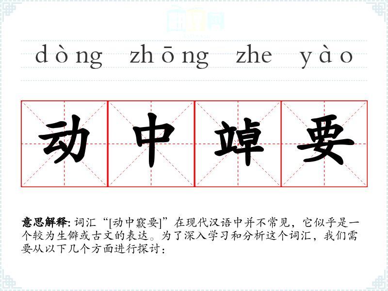 词汇“[动中窾要]”在现代汉语中并不常见,它似乎是一个较为生僻或古文的表达。为了深入学*和分析这个词汇,我们需要从以下几个方面进行探讨: