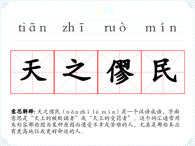 天之僇民(tiān zhī lù mín)是一个汉语成语,字面意思是“天上的被贬谪者”或“天上的受罚者”。这个词汇通常用来形容那些因为某种原因而遭受不幸或苦难的人,尤其是那些本应有更高地位或更好命运的人。