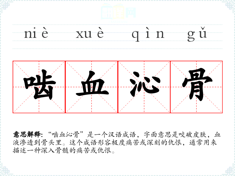 “啮血沁骨”是一个汉语成语,字面意思是咬破皮肤,血液渗透到骨头里。这个成语形容极度痛苦或深刻的仇恨,通常用来描述一种深入骨髓的痛苦或仇恨。