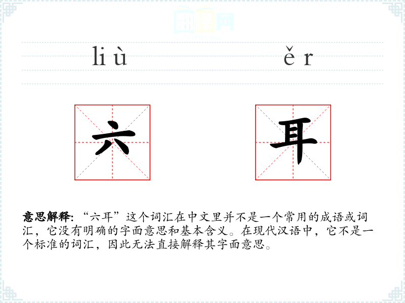 “六耳”这个词汇在中文里并不是一个常用的成语或词汇,它没有明确的字面意思和基本含义。在现代汉语中,它不是一个标准的词汇,因此无法直接解释其字面意思。