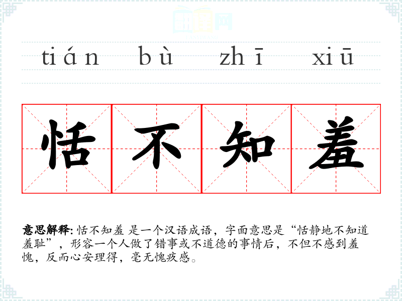 恬不知羞 是一个汉语成语,字面意思是“恬静地不知道羞耻”,形容一个人做了错事或不道德的事情后,不但不感到羞愧,反而心安理得,毫无愧疚感。