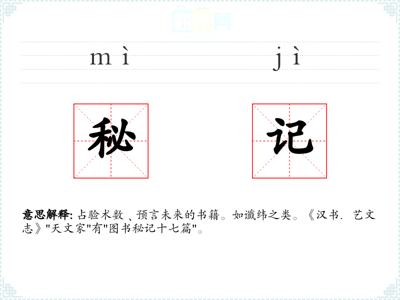 占验术数﹑预言未来的书籍。如谶纬之类。《汉书.艺文志》"天文家"有"图书秘记十七篇"。