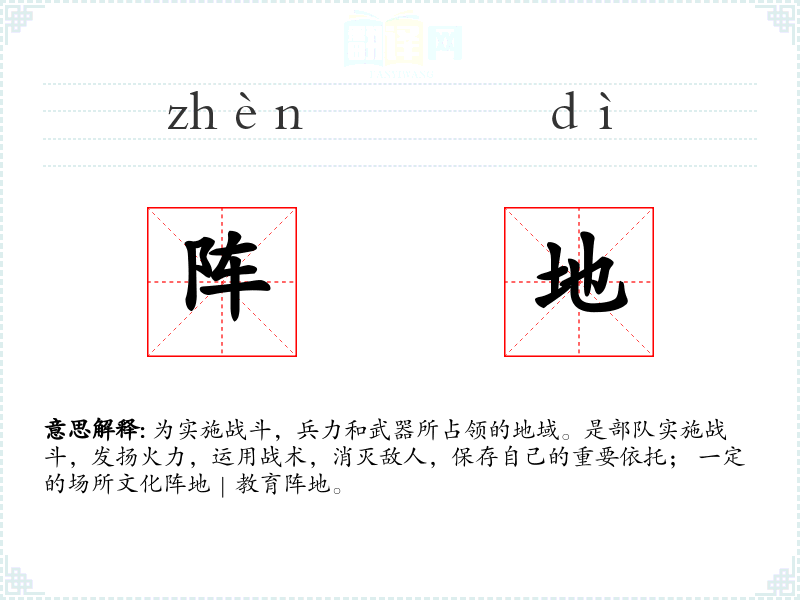 为实施战斗,兵力和武器所占领的地域。是部队实施战斗,发扬火力,运用战术,消灭敌人,保存自己的重要依托; 一定的场所文化阵地|教育阵地。
