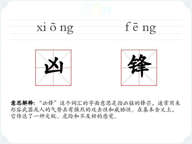 “凶锋”由“凶”和“锋”两个字组成。“凶”字在古代汉语中指不吉利或危险,“锋”字则指刀剑的尖端或前端。这两个字的结合,形成了形容具有强烈攻击性或危险性的概念。