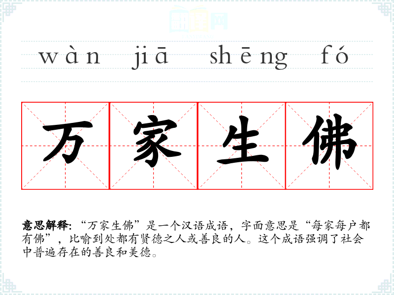 “万家生佛”是一个汉语成语,字面意思是“每家每户都有佛”,比喻到处都有贤德之人或善良的人。这个成语强调了社会中普遍存在的善良和美德。