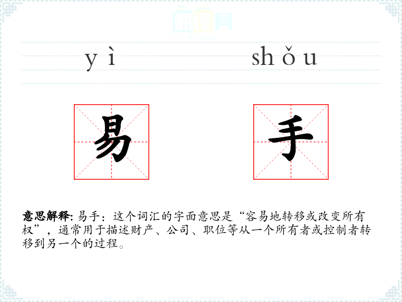 易手:这个词汇的字面意思是“容易地转移或改变所有权”,通常用于描述财产、公司、职位等从一个所有者或控制者转移到另一个的过程。
