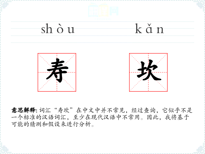 词汇“寿坎”在中文中并不常见,经过查询,它似乎不是一个标准的汉语词汇,至少在现代汉语中不常用。因此,我将基于可能的猜测和假设来进行分析。