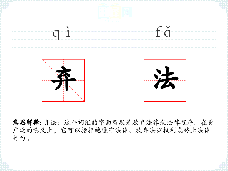 弃法:这个词汇的字面意思是放弃法律或法律程序。在更广泛的意义上,它可以指拒绝遵守法律、放弃法律权利或终止法律行为。