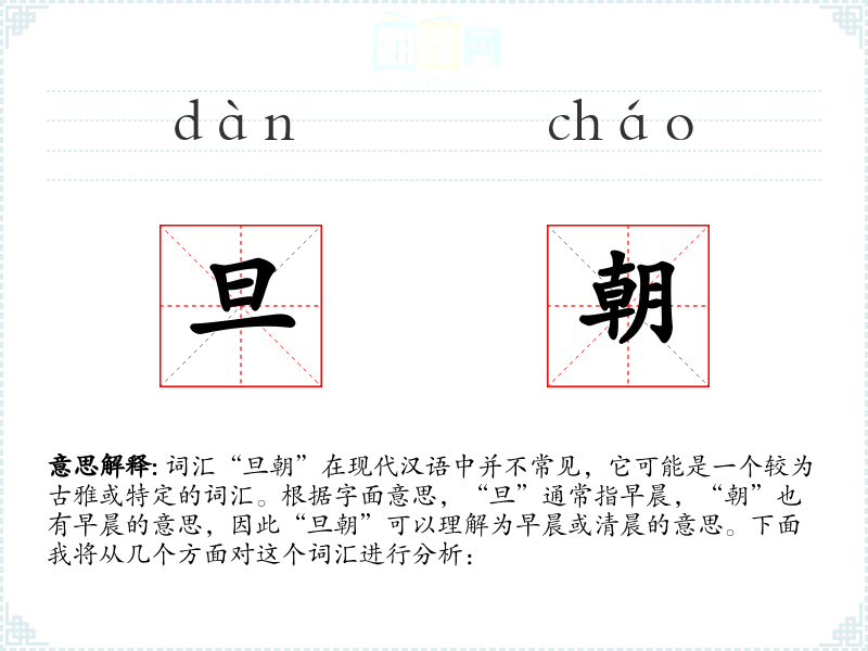 “旦”和“朝”都有早晨的意思,组合在一起强调了早晨的概念。在古代汉语中,这样的组合可能更加常见,但随着语言的发展,这样的词汇逐渐被更简单的词汇所替代。