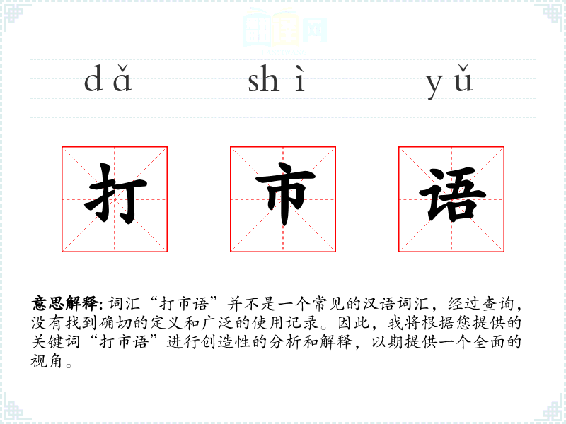 - 专业领域:在商业或市场研究中,可能会用“打市语”来指代那些专业术语或行业内的特定表达方式。