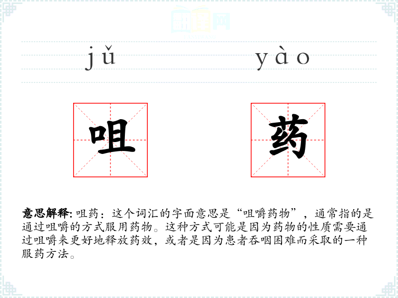 咀药这个词汇在中文中相对直接,由“咀”和“药”两个字组成,没有复杂的词源故事。随着现代医学的发展,这个词汇的使用可能会有所增加,尤其是在涉及特殊药物服用方式的场合。