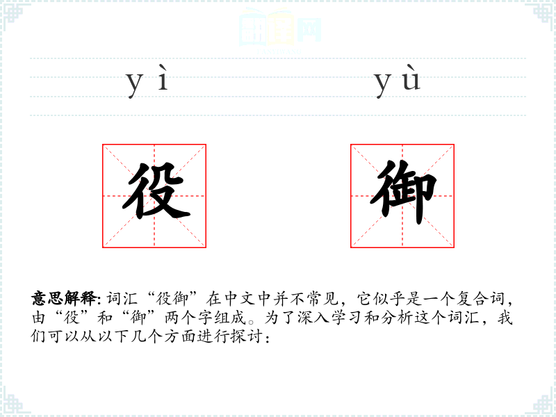 词汇“役御”在中文中并不常见,它似乎是一个复合词,由“役”和“御”两个字组成。为了深入学*和分析这个词汇,我们可以从以下几个方面进行探讨: