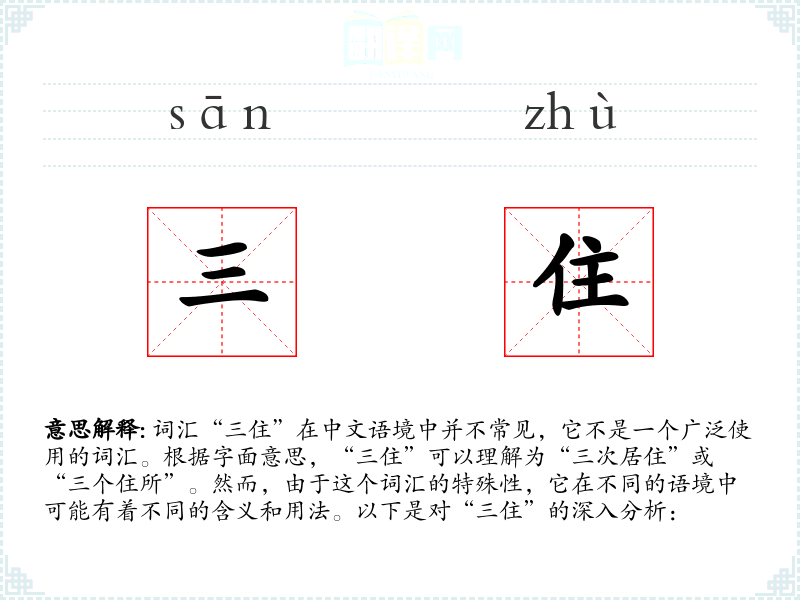 - 词源:由于“三住”不是一个常用词汇,其词源不明确,可能是由“三”和“住”两个字组合而成。