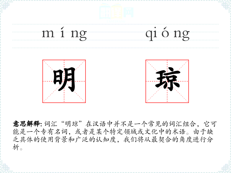 由于“明琼”不是一个常用词汇,它在不同语境下的使用可能非常有限。如果是一个专有名词,它可能出现在文学作品、地名、人名或特定文化背景中。