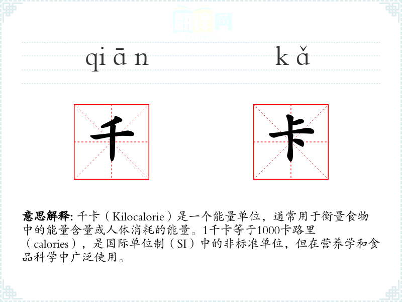 “千卡”源自法语“kilocalorie”,由“kilo-”(千)和“calorie”(卡路里)组成。卡路里最初用于衡量热能,后来在营养学中被广泛用于衡量食物能量。