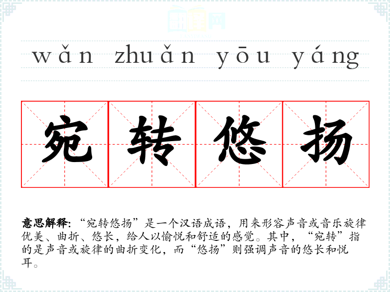 “宛转悠扬”是一个汉语成语,用来形容声音或音乐旋律优美、曲折、悠长,给人以愉悦和舒适的感觉。其中,“宛转”指的是声音或旋律的曲折变化,而“悠扬”则强调声音的悠长和悦耳。
