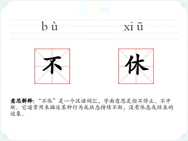 “不休”是一个汉语词汇,字面意思是指不停止、不中断。它通常用来描述某种行为或状态持续不断,没有休息或结束的迹象。
