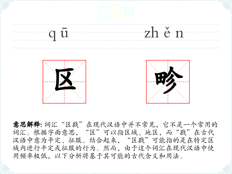 词汇“区戡”在现代汉语中并不常见,它不是一个常用的词汇。根据字面意思,“区”可以指区域、地区,而“戡”在古代汉语中意为平定、征服。结合起来,“区戡”可能指的是在特定区域内进行平定或征服的行为。然而,由于这个词汇在现代汉语中使用频率极低,以下分析将基于其可能的古代含义和用法。
