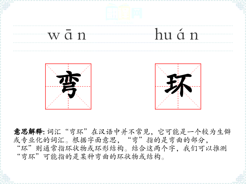 词汇“弯环”在汉语中并不常见,它可能是一个较为生僻或专业化的词汇。根据字面意思,“弯”指的是弯曲的部分,“环”则通常指环状物或环形结构。结合这两个字,我们可以推测“弯环”可能指的是某种弯曲的环状物或结构。